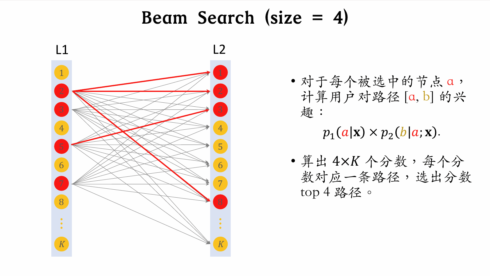 • 寻找与 item\text{item} 最相关的 JJpath\text{path},且避免一条路径上物品过多。
