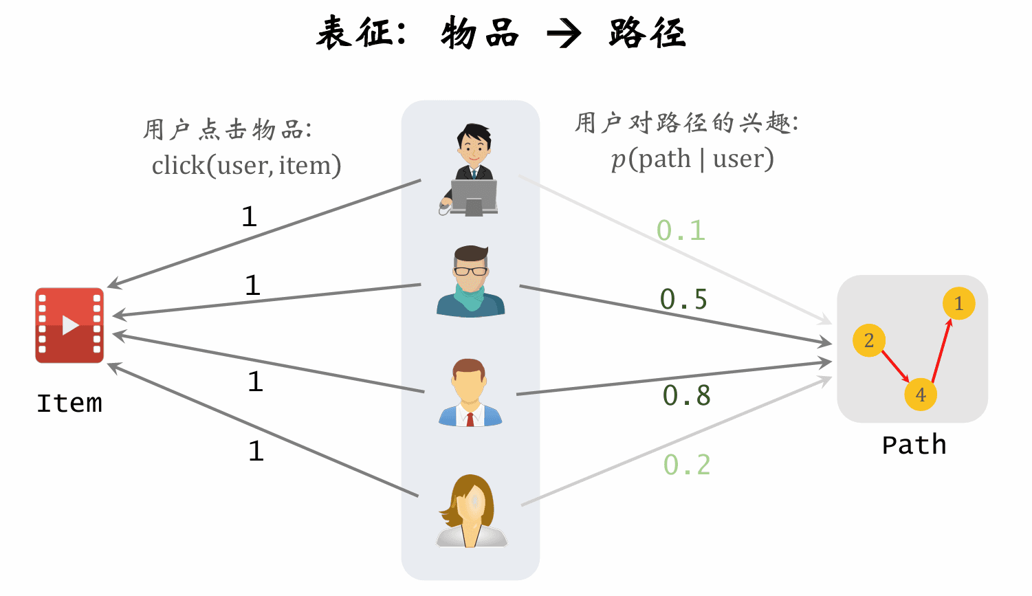 物品 用户点击过物品\longleftarrow _{用户点击过物品} 用户 神经网络的打分\longrightarrow _{神经网络的打分} 路径